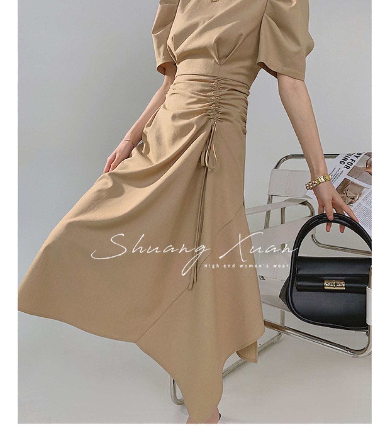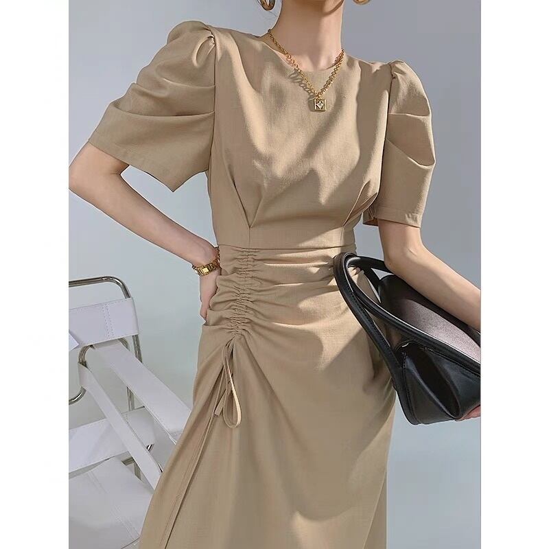 フランスのレトロなパフスリーブスプリットロングスカートウエストは細かった、デザインセンスフォールド不規則なドレス女性の夏 サマー 夏物 yingd11450848213