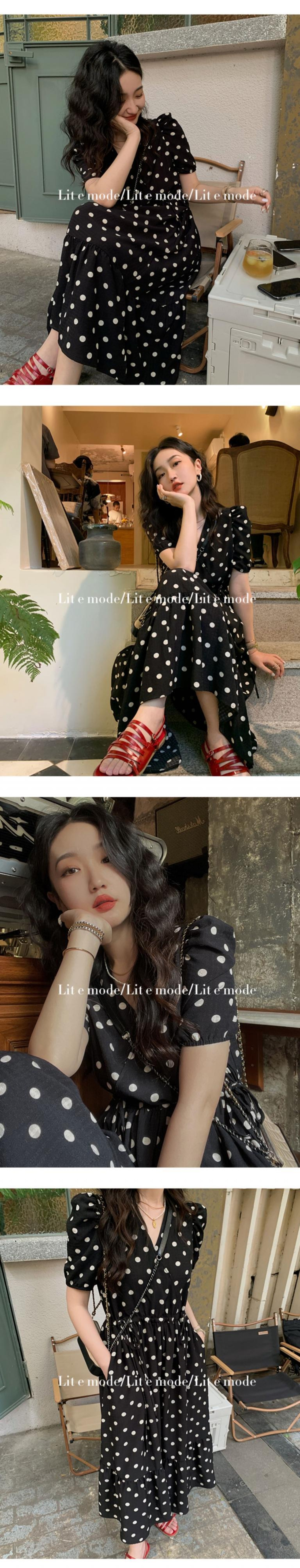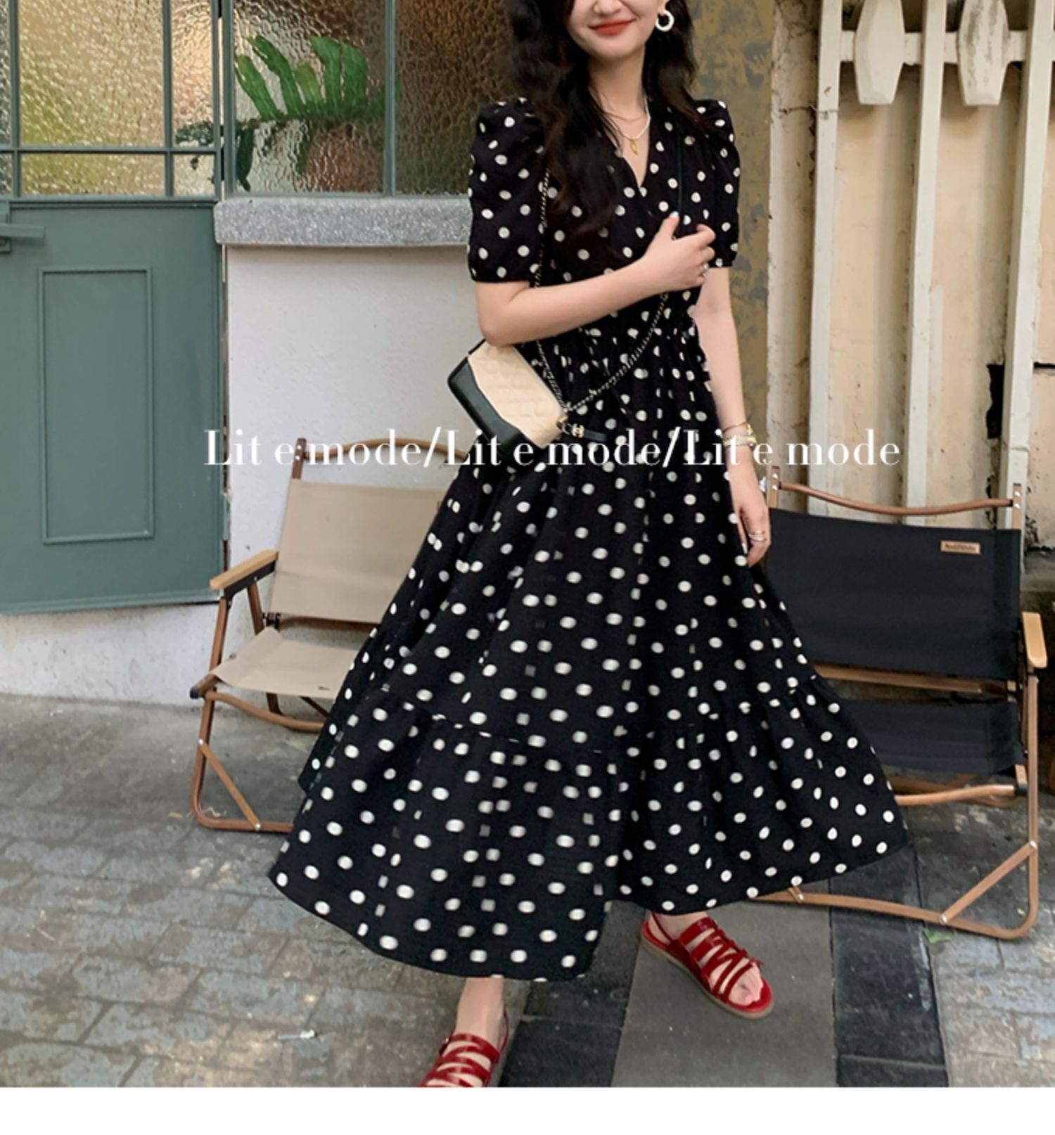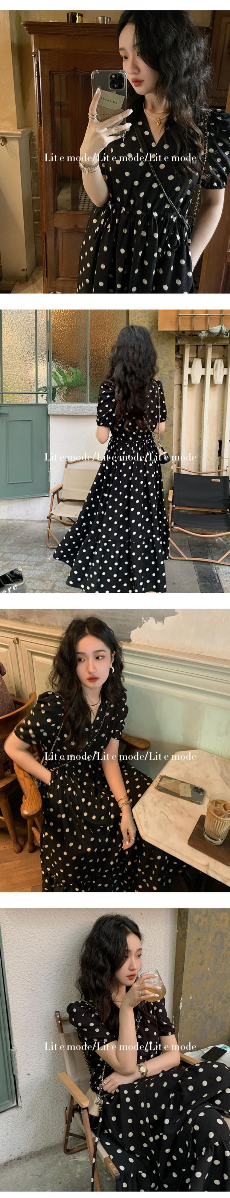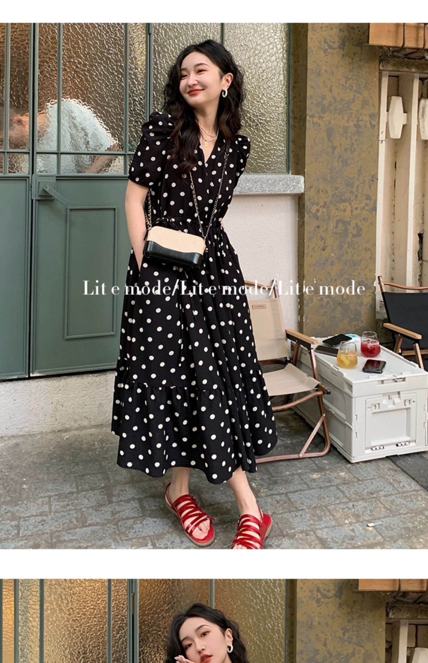 フランスのレトロなヘップバーンスタイルのニッチな膝上ロングスカートのウエストは細く、Vネックの水玉ドレスの夏のハイエンドな感覚でした サマー 夏物 yingd49975294394
