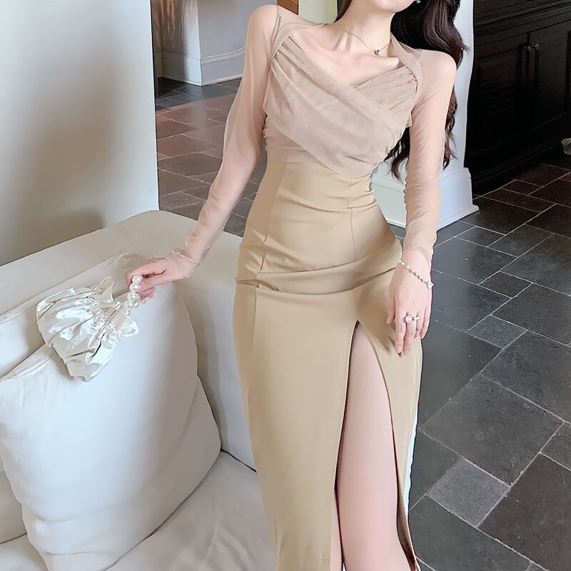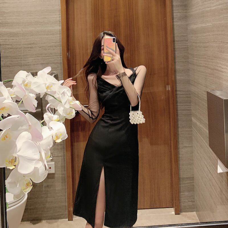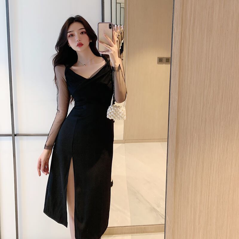 2020年秋新作女性デザインスカートライトマチュアウィンドミドル丈セクシースプリットメッシュ長袖ワンピース ロング オータム 秋物 yingd17456694398