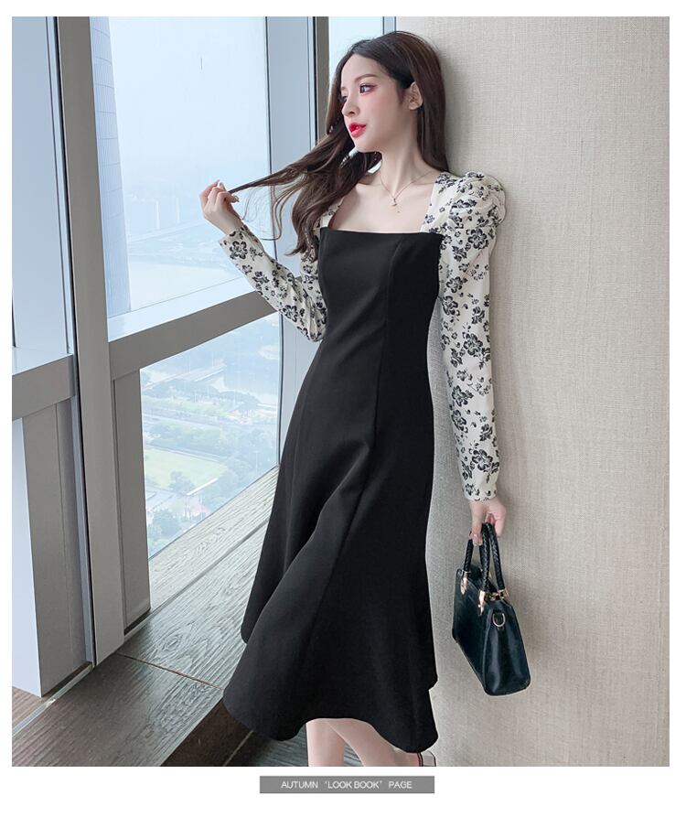 フランスのレトロなヘップバーンスタイルの黒いニッチな膝上ロングスカート高品質のスクエアネックウエストフィッシュテールドレス女性の秋の服 ブラック オータム 秋物 スクウェア yingd48789912645