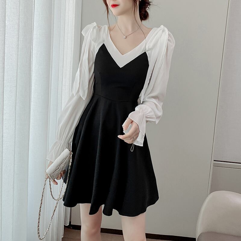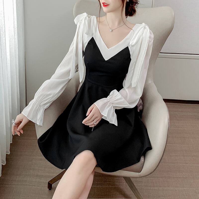 2020年秋新作女性デザインスカートライトマチュアスタイルエインスタイルコントラストカラーVネック長袖ワンピースレディース ロング オータム 秋物 yingd76809742609