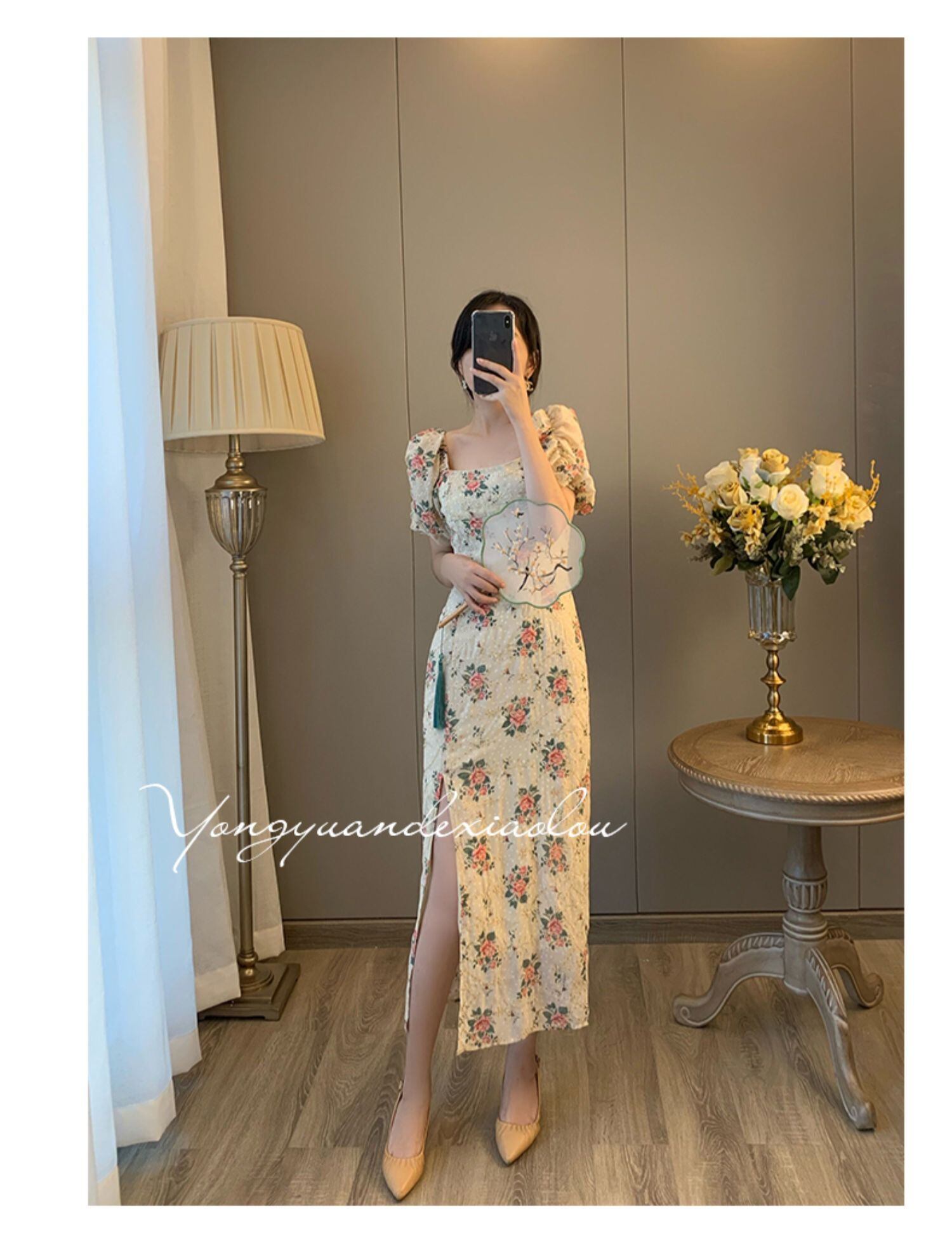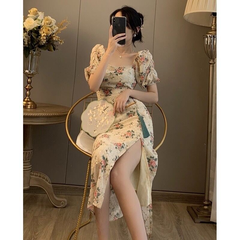 改良されたチャイナドレスサマーティーブレイクロングドレススリムスリミングハイエンドセンスのスクエアネック刺繡フローラルスプリットドレス女性夏 刺繍 夏物 花柄 スクウェア yingd14274408229