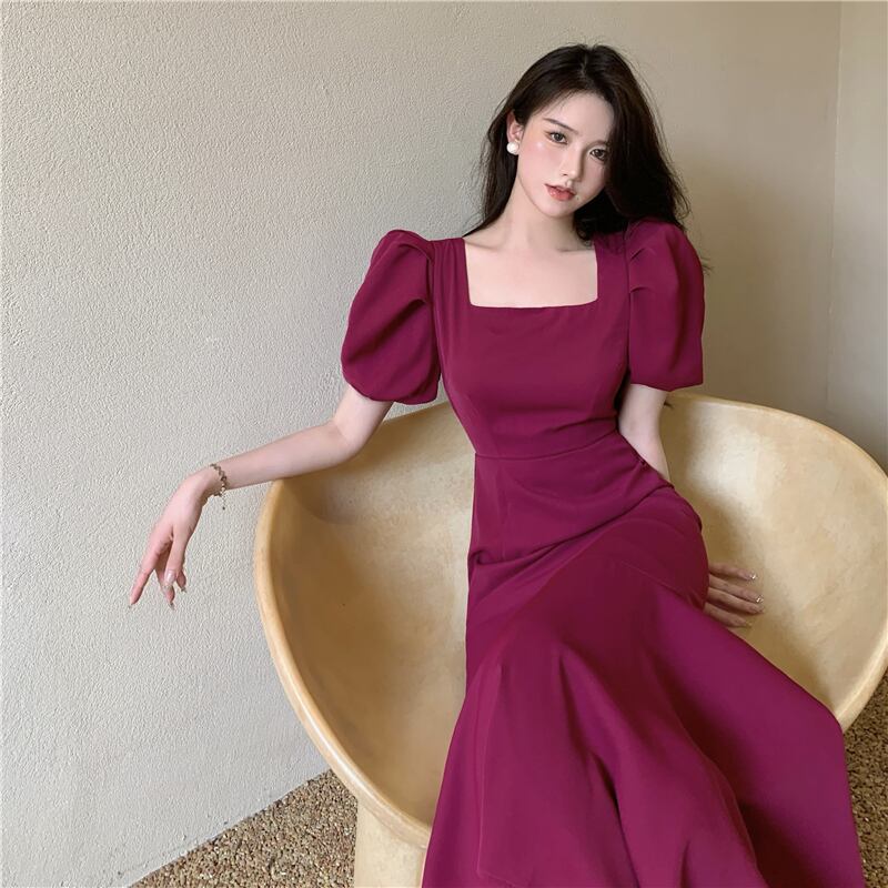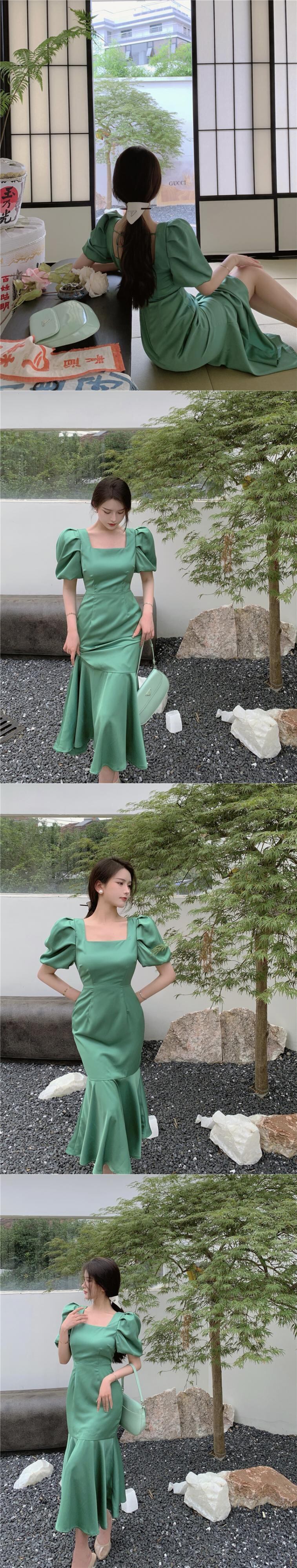 フランスのレトロなニッチな膝上ロングスカートウエストは細く、高級感のあるスクエアネックパフスリーブフィッシュテールドレス夏 サマー 夏物 スクウェア yingd92729860979