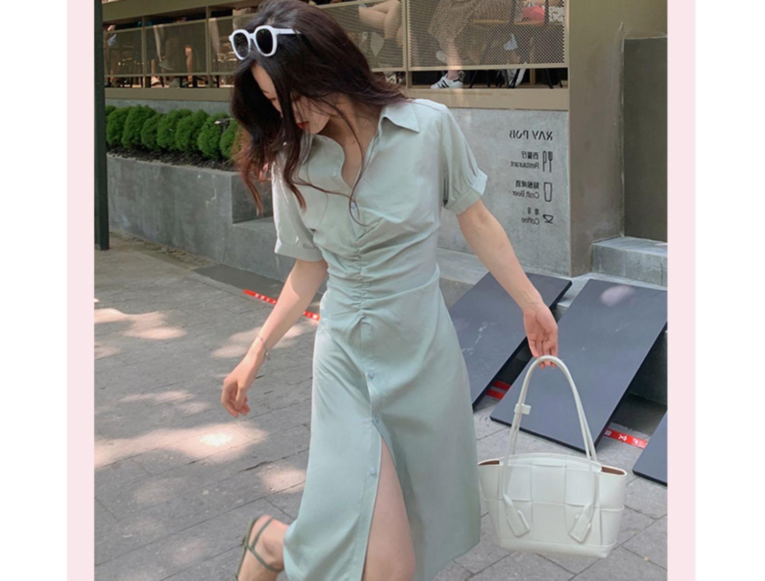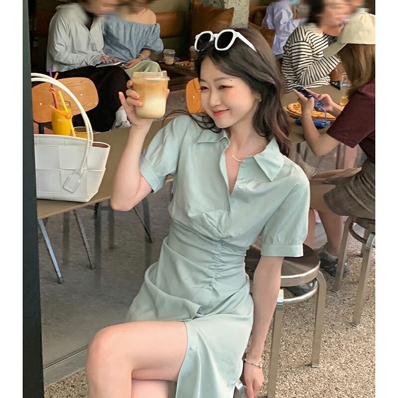 フランスのレトロシックなデザインのニッチシャツスカートの女神ファンハイセンスウエストシャツドレス夏の薄いセクション サマー 夏物 yingd45398066010
