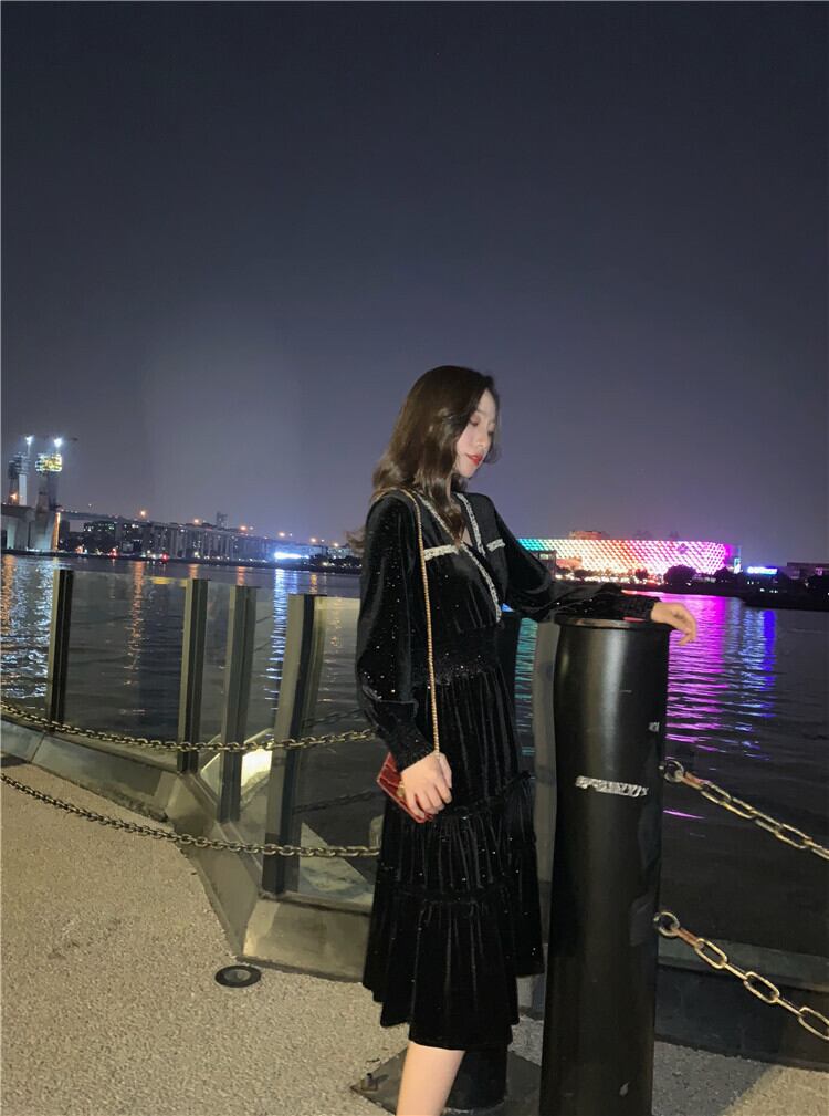 フランスのレトロなヘップバーンの陰謀リトルブラックドレス気質の女神ファンVネックウエストスリミングベルベットドレス女性の秋と冬 オータム 秋物 ウィンター 冬物 yingd80890670652