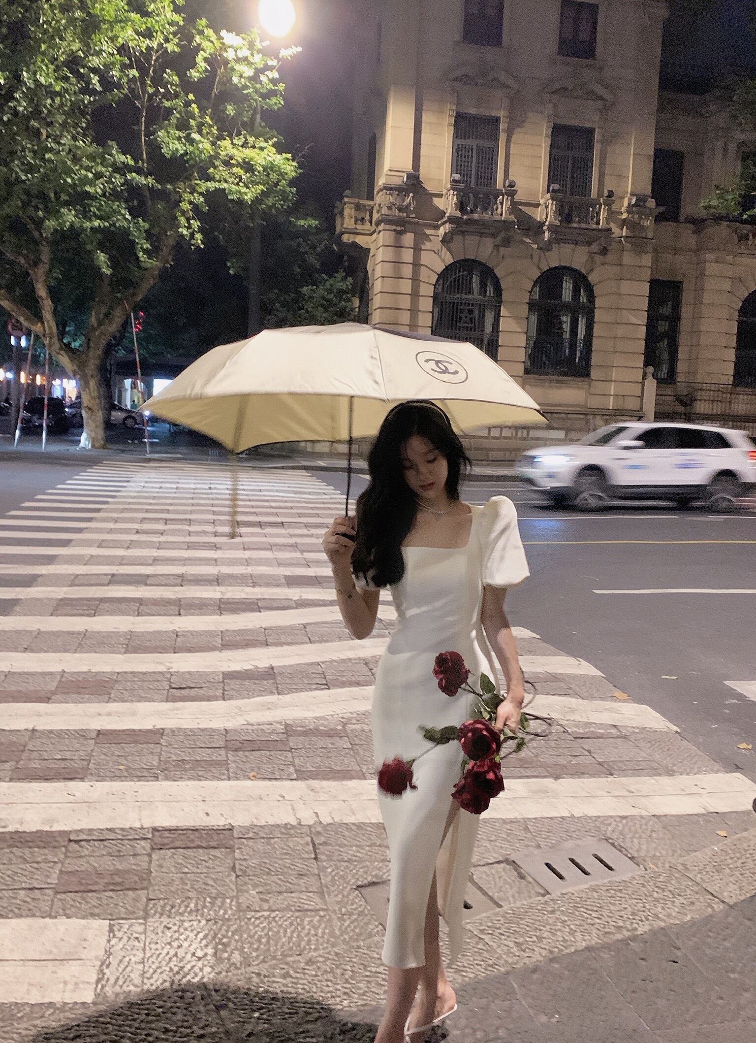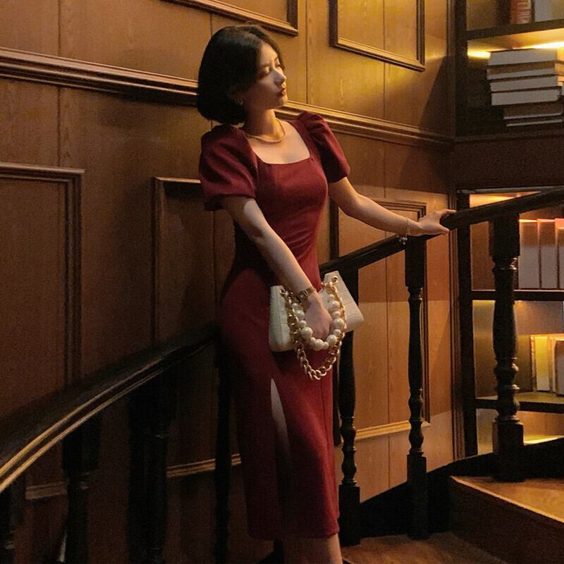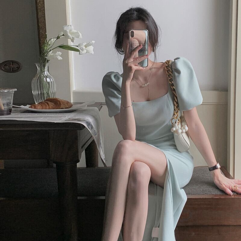 フランスのレトロシックなデザインのロングスカートのウエストは薄くなったハイセンスライトラグジュアリーパフスリーブスプリットドレス女性の夏 サマー 夏物 yingd40307099557