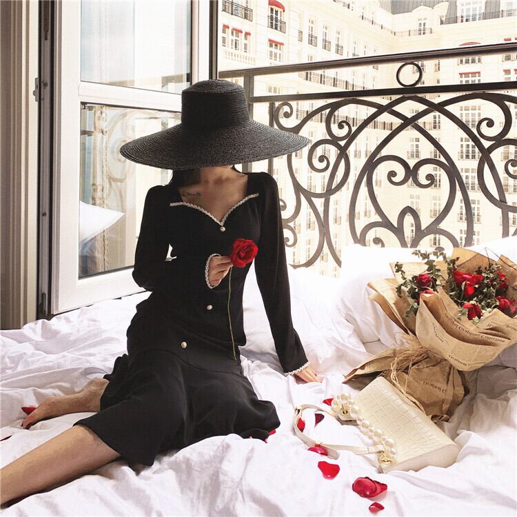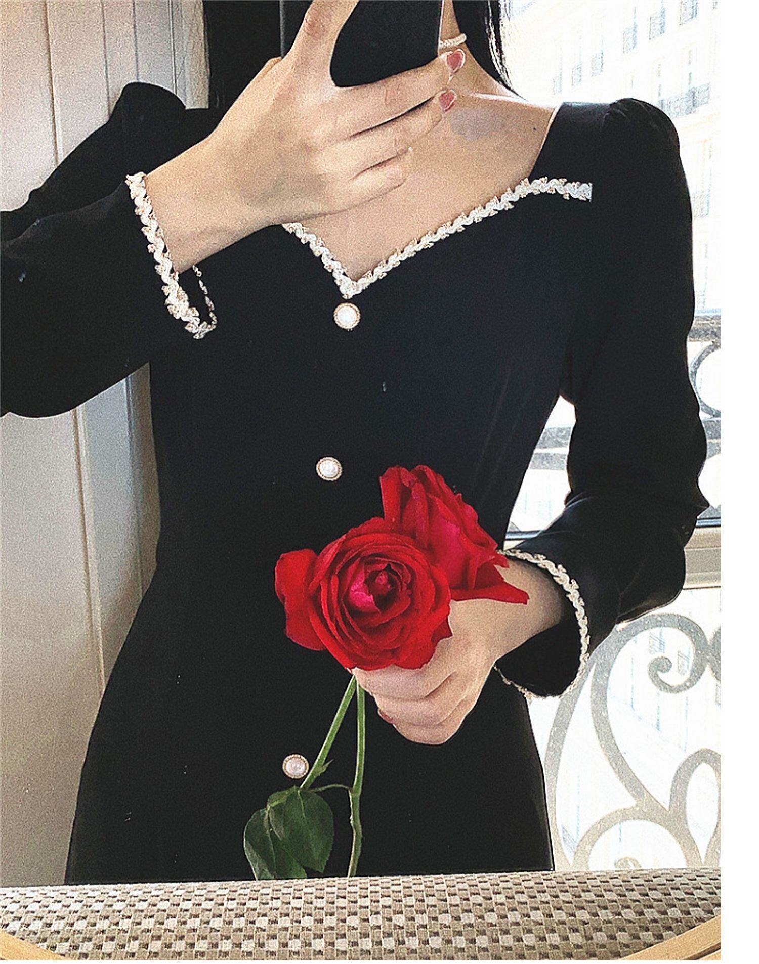 フレンチレトロヘップバーンスタイルリトルブラックドレス、シック、ハイCLセンス、ライトラグジュアリー、レディースウエスト長袖スクエアカラードレス女性秋 ロング オータム 秋物 スクウェア yingd69925743582