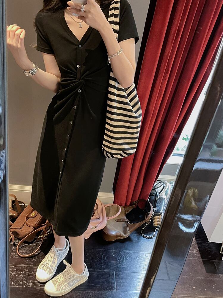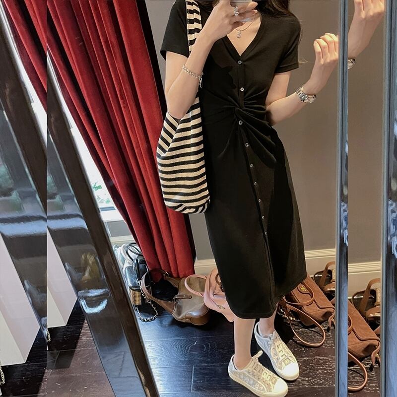 フランスのレトロシックなデザインのスカートスリムスリム膝上ロングVネックハイエンドドレス女性の夏 サマー 夏物 yingd37786991506