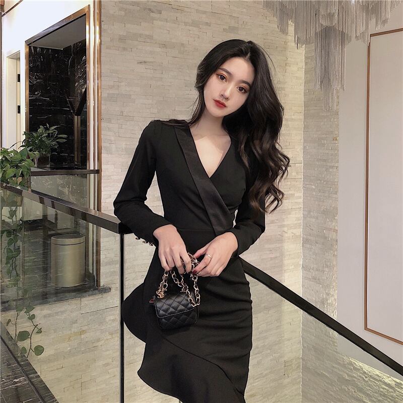 フランスのレトロなデザインのニッチなフリルウエストと薄い気質のドレス女性の秋と冬のヘップバーンスタイルのリトルブラックドレス オータム 秋物 ウィンター 冬物 yingd85094592526