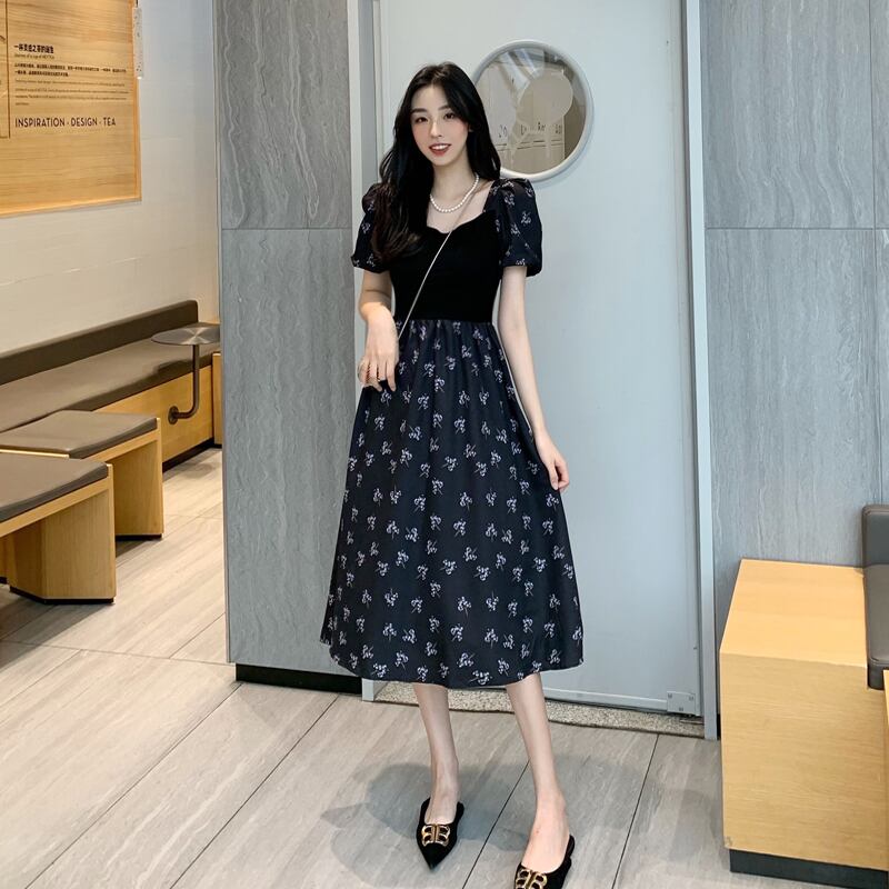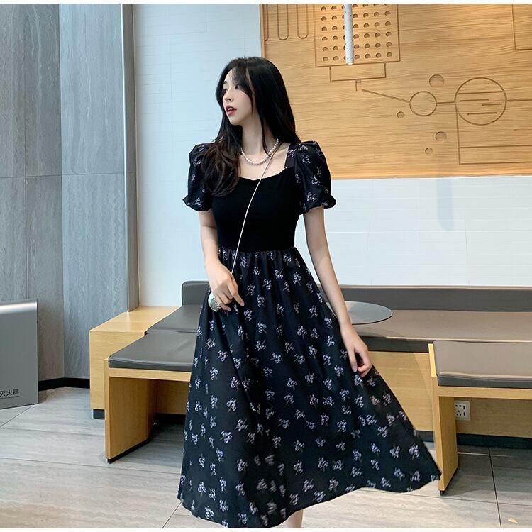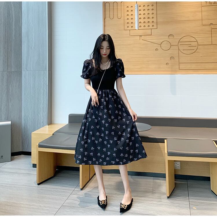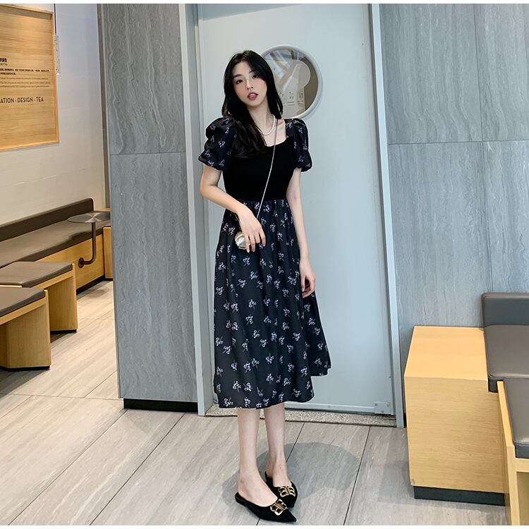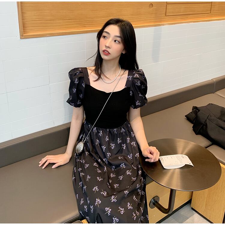 フランスの優しいティーブレイクキキョウスカートウエストは細くて気質の黒い四角い襟花柄パフスリーブドレス女性の夏 ブラック サマー 夏物 スクウェア yingd59397049649