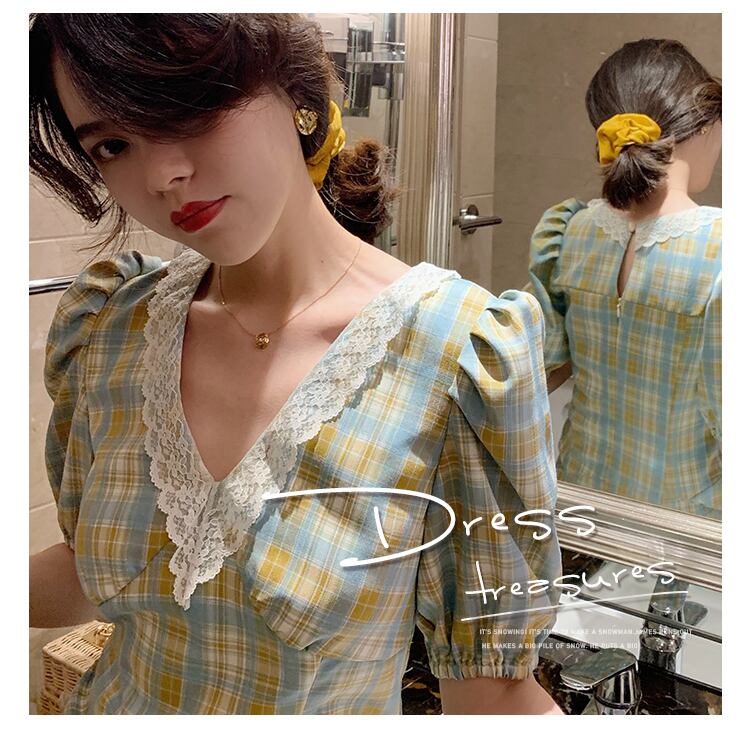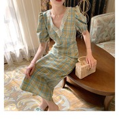 フランスのレトロな優しいスタイルのティーブレイクベルフラワースカートシックなハイエンドドレスVネックパフスリーブチェック柄ドレス夏 サマー 夏物 フラワーデザイン yingd63759779755