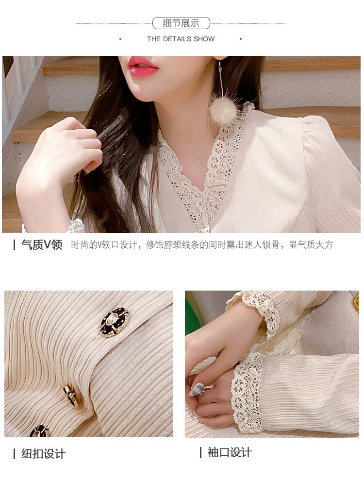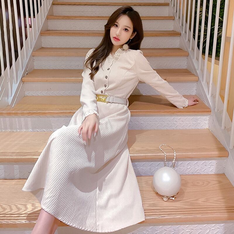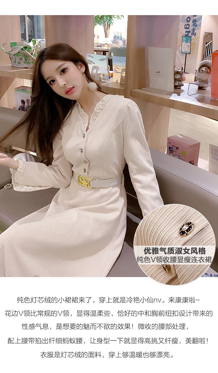 フレンチレトロミドル丈ウエストウエストは細くて軽い高級レディースレースVネックコーデュロイドレス秋冬女性 オータム 秋物 ウィンター 冬物 yingd70261618971