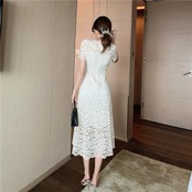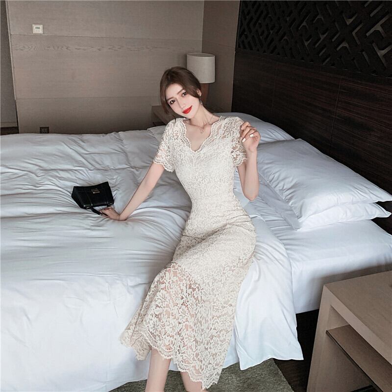 フランスのレトロな気質フェミニンでセクシーなニッチな膝上ロングスカートスリムな高さのセットVネックレースドレス女性の夏 サマー 夏物 yingd91035871716