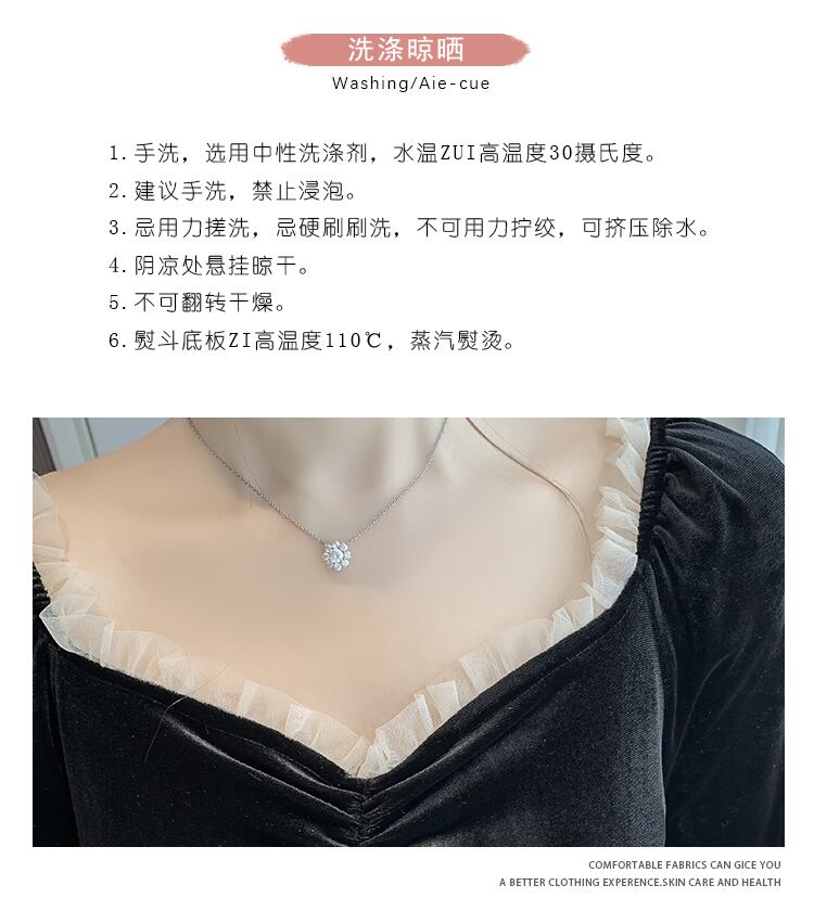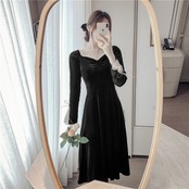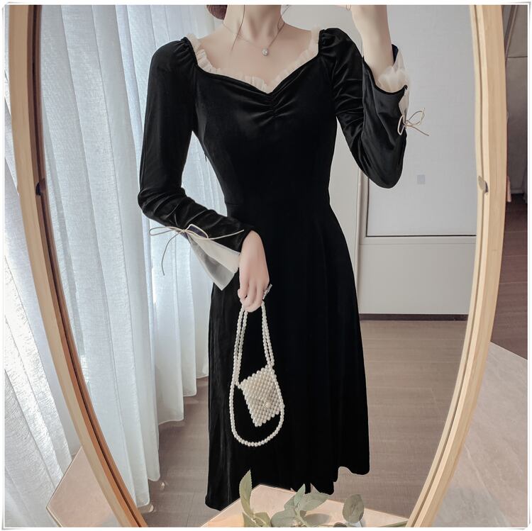 フレンチレトロウエストウエストは細くて軽い高級レディースレースステッチ黒長袖ベルベットドレス秋冬女性 ロング ブラック オータム 秋物 ウィンター 冬物 yingd37864373401