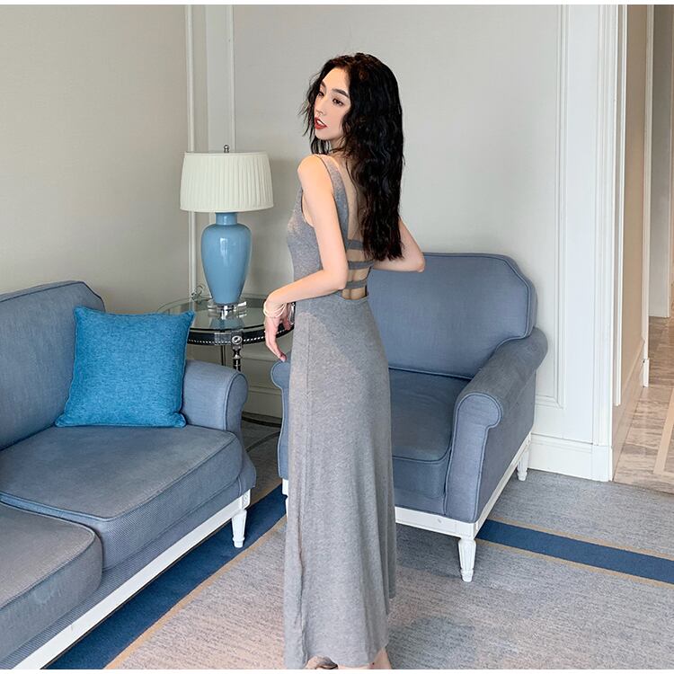 フランスのレトロなスリングロングスカート女性の夏のウエストは細く、気質の女神ファンのセクシーな背中の開いたサスペンダードレス女性の夏 サマー 夏物 yingd58676750462