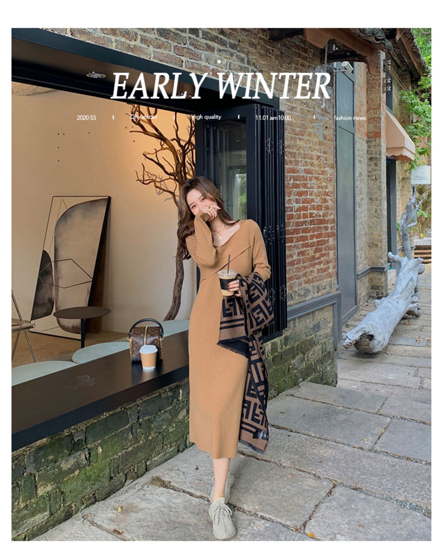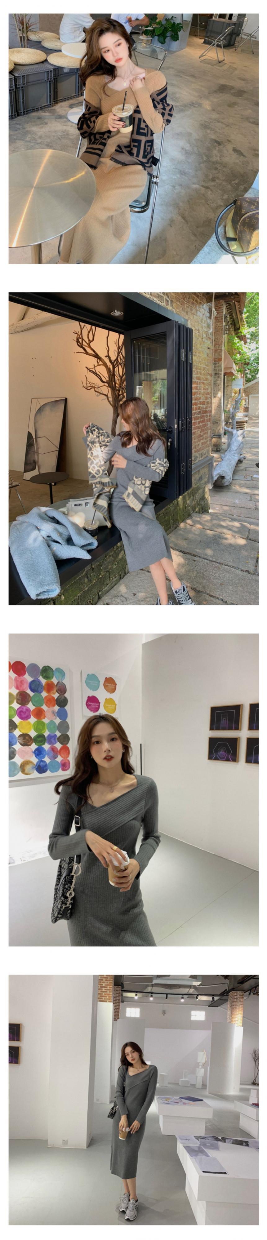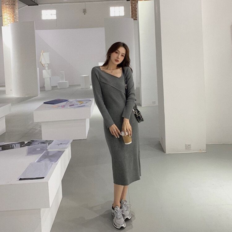 フランスの穏やかな風のニッチ非対称Vネックピットストリップ膝ニットドレス女性の秋と冬の長袖ボトミングスカート ロング オータム 秋物 ウィンター 冬物 yingd6020156624