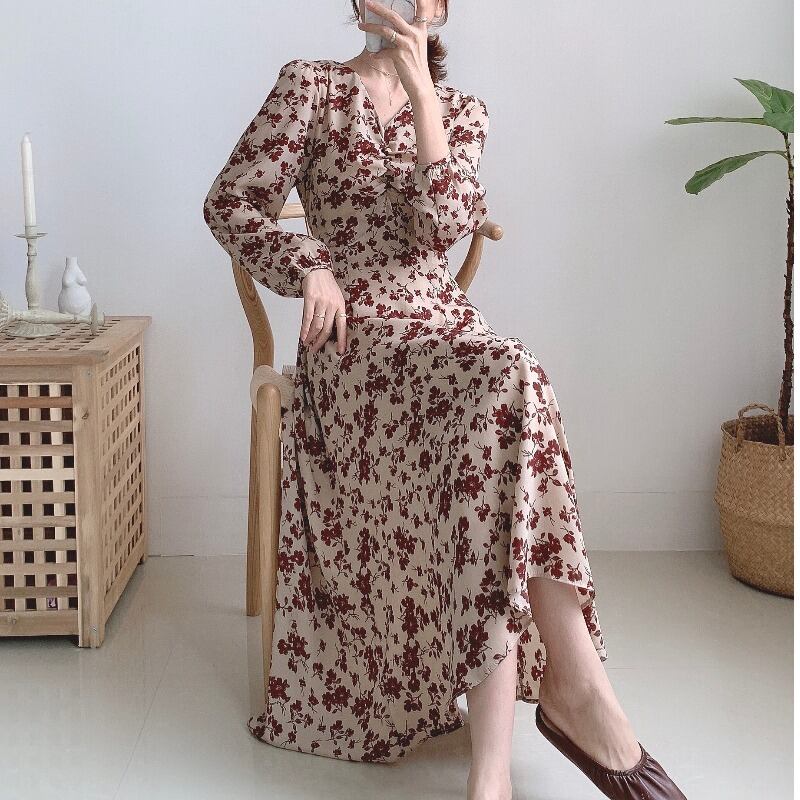 2021年春の新しいフレンチレトロウエストウエストは細くて軽い大人っぽいスタイルのVネックフローラルドレス女性の春と秋 スプリング 春物 オータム 秋物 花柄 yingd78024545203