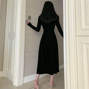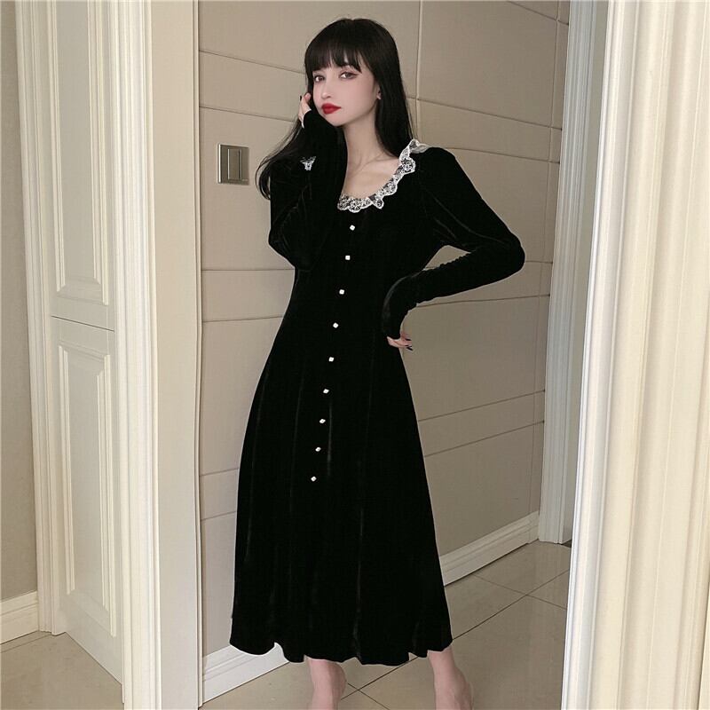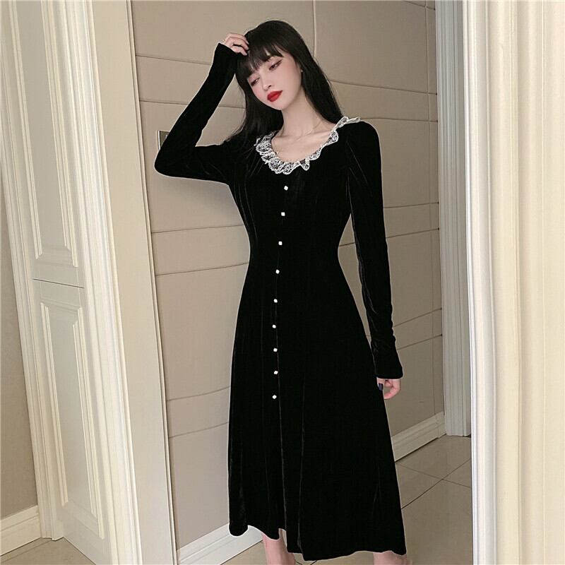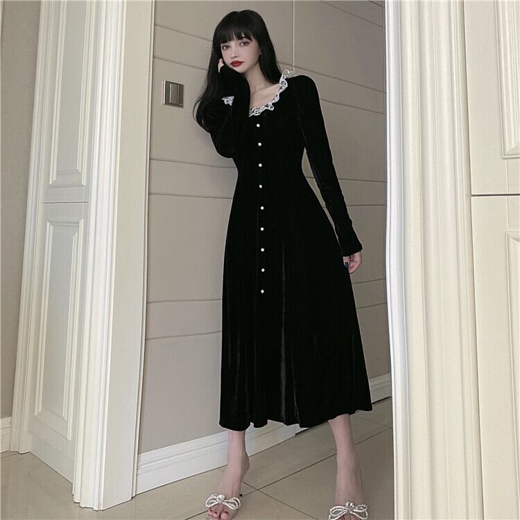 フレンチレトロヘップバーンスタイルのウエストは細く、レディースライトマチュアレーストリムブラックベルベットドレスレディース秋冬 オータム 秋物 ウィンター 冬物 yingd63339390636