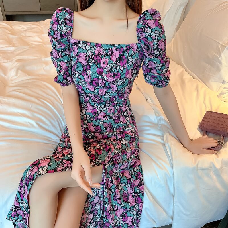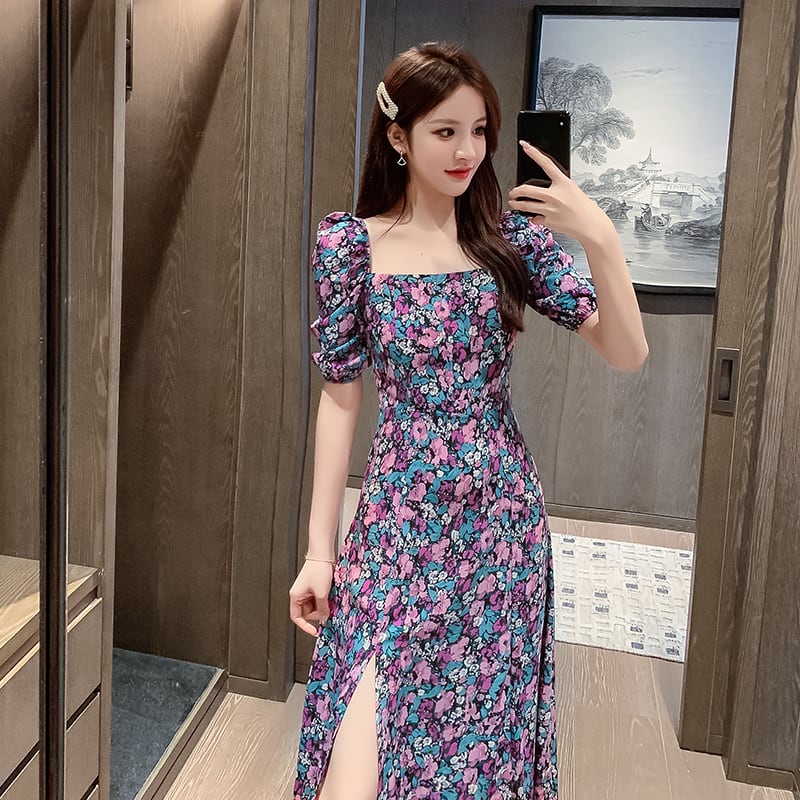 フランスのレトロなスクエアカラーのパフスリーブスプリットフローラルドレス女性の夏のウエストは細くて気質ヘプバーンフローラルドレス サマー 夏物 花柄 スクウェア yingd8061991244