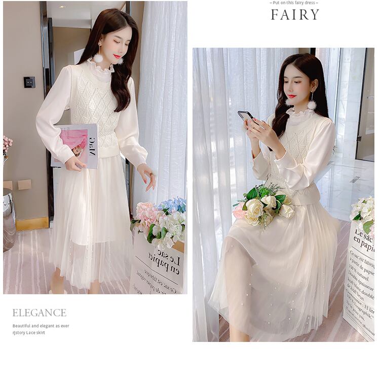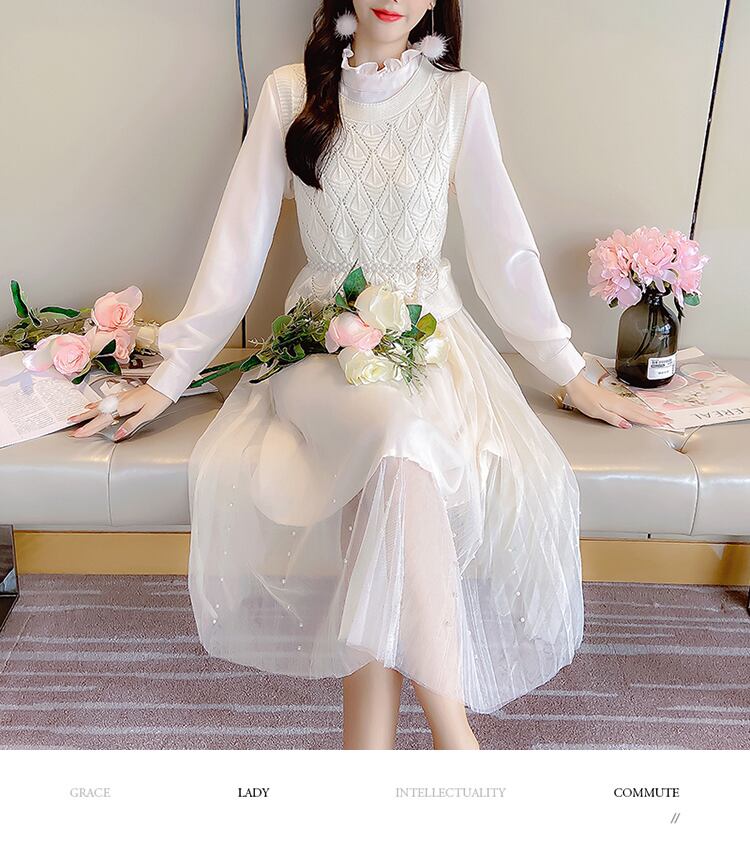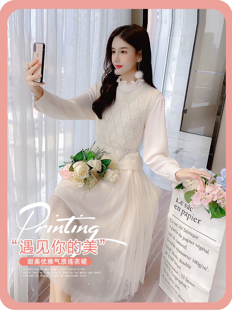 2020年秋新作レディースウエストウエストと薄手の気質優しいオーバーザニーメッシュワンピースニットベストツーピース オータム 秋物 yingd72298180840