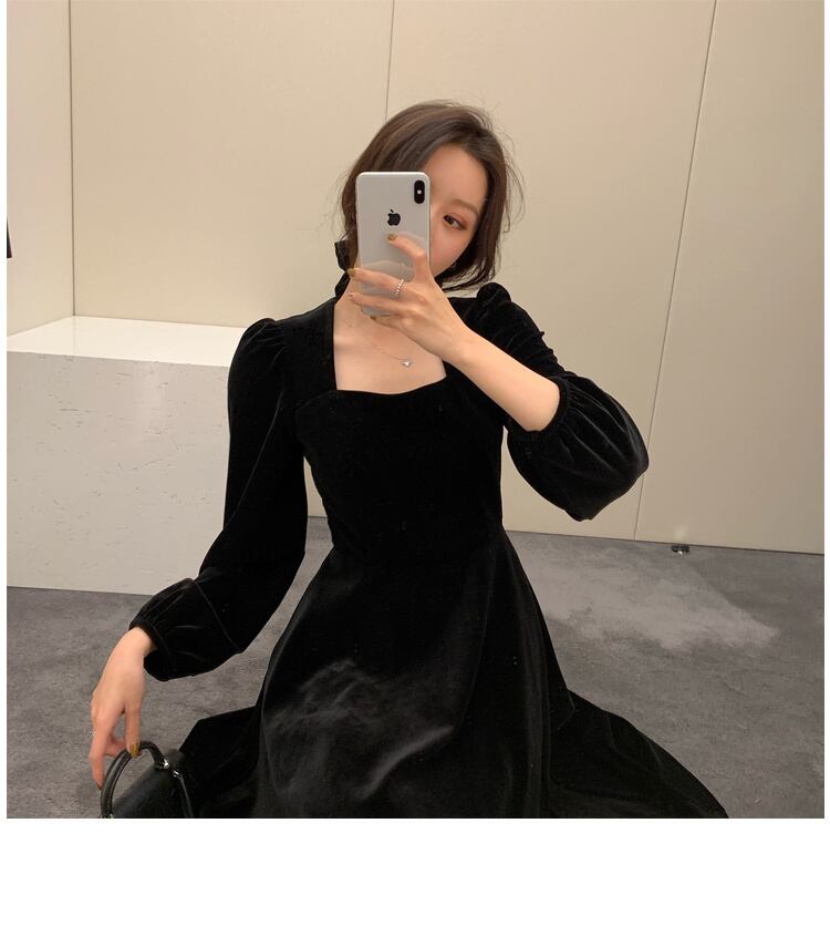 フランスのレトロなヘップバーンスタイルのリトルブラックドレスのウエストは細く、気質のパフスリーブスクエアカラーベルベットドレス女性の秋と冬 オータム 秋物 ウィンター 冬物 スクウェア yingd19538667724