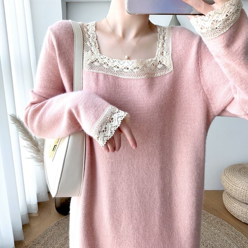 膝上ロングセータースカートフレンチレトロ気質レディーススクエアカラーレースサイドニットワンピース秋冬女性 オータム 秋物 ウィンター 冬物 スクウェア yingd55291255485