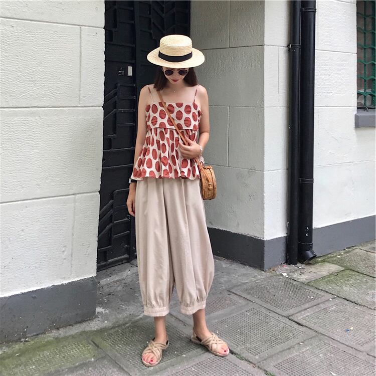 2019夏ニューウェーブドットキャミソールルーズブルマカジュアルスーツ女性海辺バケーションツーピーストレンド サマー 夏物 ショーツ ブルマー yingd73272372784