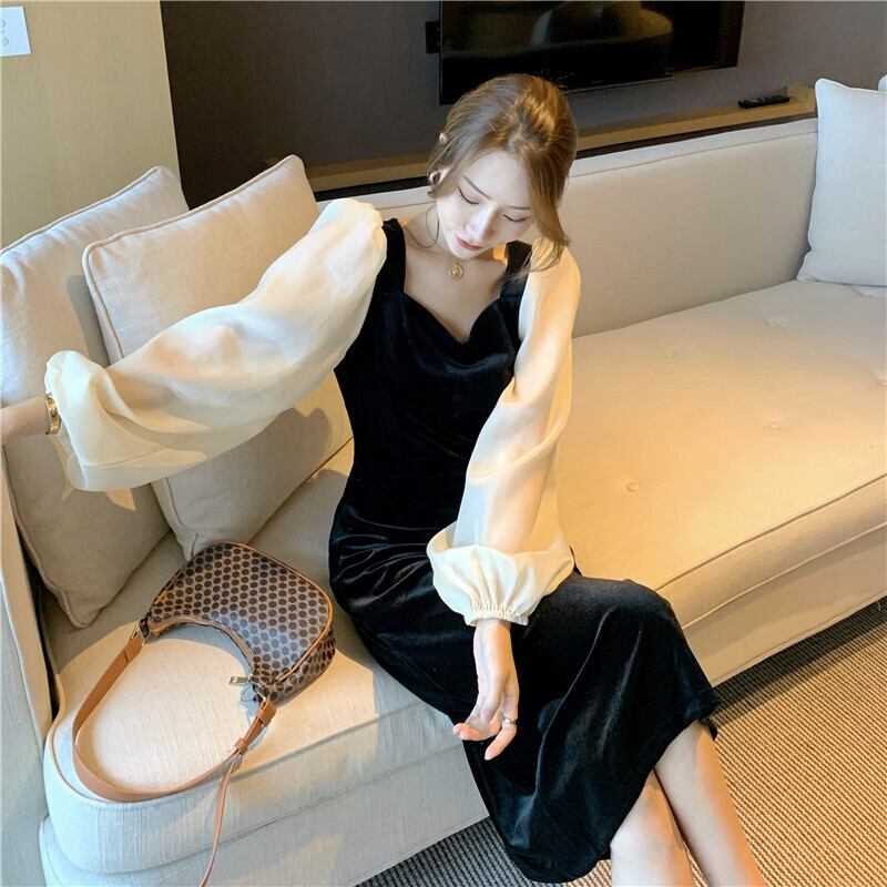 フランスのレトロなロングスカートは薄くて気性の高い女神ファンパフスリーブリトルブラックドレス長袖ドレス女性秋冬 オータム 秋物 ウィンター 冬物 yingd2090146963