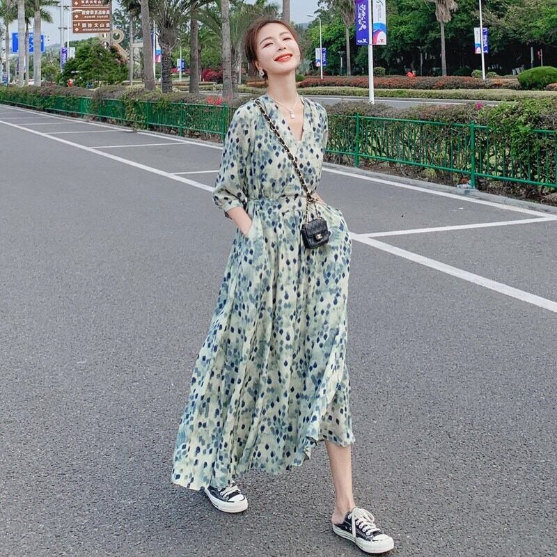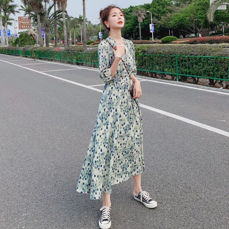 フランスのレトロなティーブレイク初恋ロングスカートウエストは細くて気質ゆじえ軽く調理された風花妖精ドレス薄片 花柄 yingd44556666455