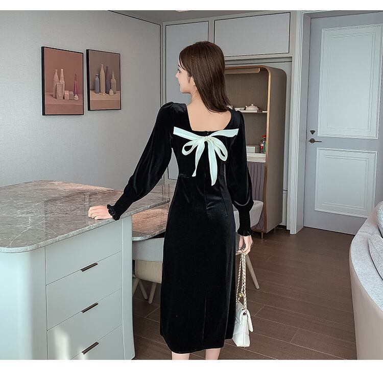 フランスのレトロなヘップバーンスタイルのリトルブラックドレスセクシーで注意深いマシンオープンバックライト成熟したスタイル長袖ベルベットドレス女性の秋と冬 ロング オータム 秋物 ウィンター 冬物 yingd83460895312