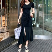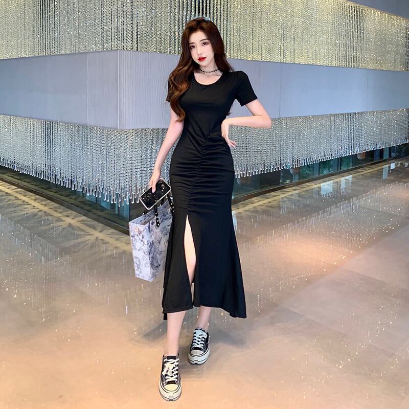 フランスのレトロなヘップバーンスタイルのロングスカート夏のウエストは細く、気質デザインの折り畳みバッグヒップスプリットドレス女性の夏の感覚 サマー 夏物 yingd3605255448