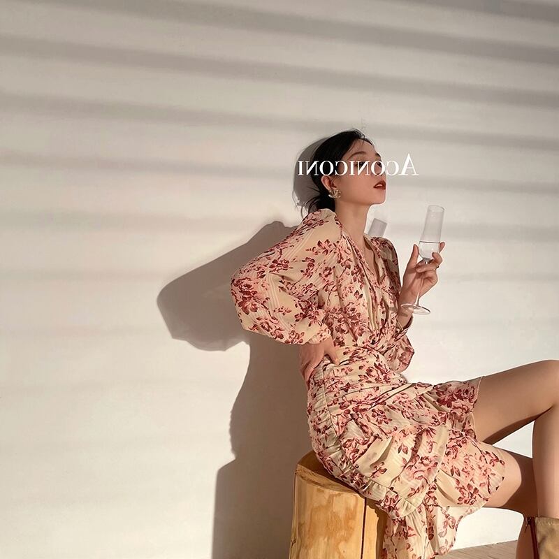2021年秋新作冷風婦人服ハイエンドセンス軽高級デザインセンスフローラルフィッシュテールバッグヒップドレスレディース オータム 秋物 花柄 yingd86503342426