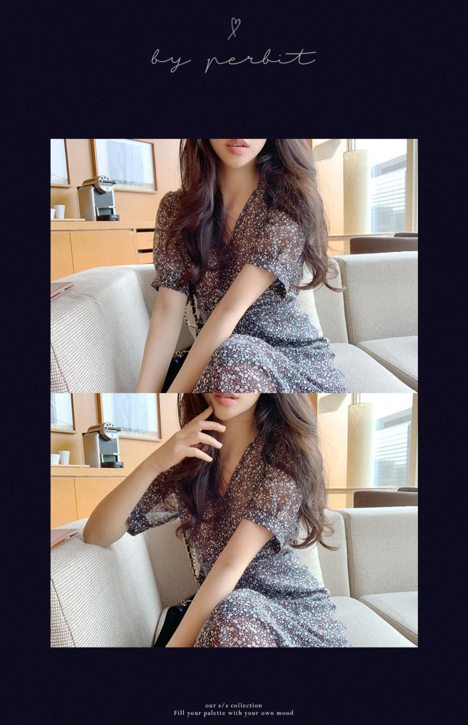 フランスのレトロな優しい風のVネックフローラルドレス、ウエストウエストは細く、シフォンフローラルフェアリードレスの薄片のセンスが高い 花柄 yingd36351900824