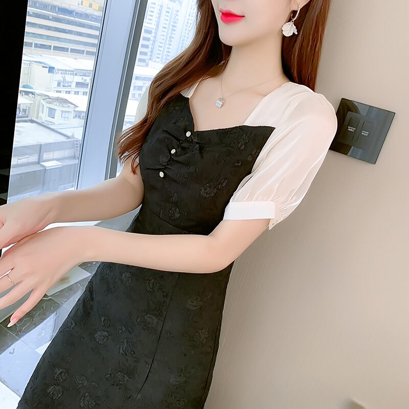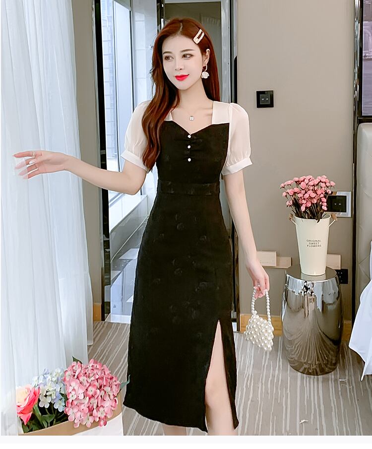 フランスのレトロなヘップバーンスタイルのリトルブラックドレス、軽い豪華な女性、スクエアネックのハイエンドセンスセクシーなスプリットフローラルドレス女性の夏 サマー 夏物 花柄 スクウェア yingd40011815779