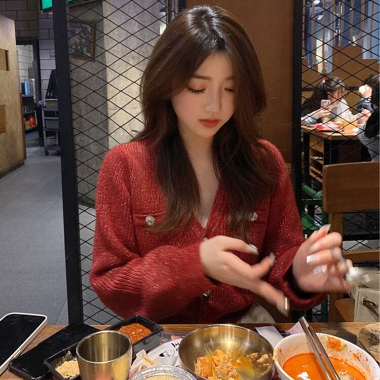 赤ニットカーディガンジャケットレディース秋冬新作フレンチレトロVネックやさしい風ショートニューイヤーセーターレディース レッド オータム 秋物 ウィンター 冬物 yingd26173899211
