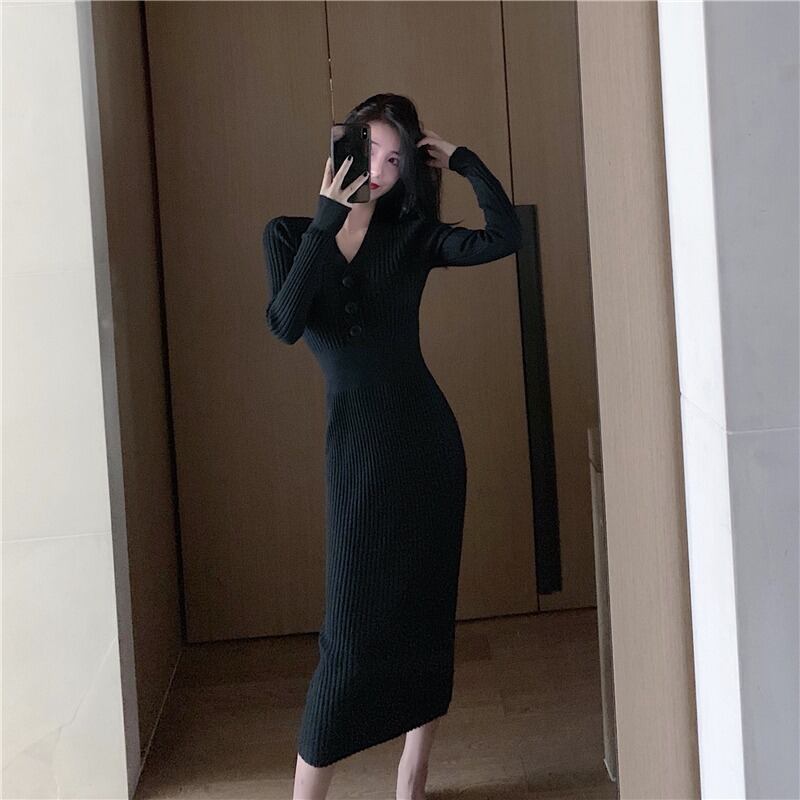 ウエストと薄い気質のフレンチレトロロングオーバーザニーセータードレス、長袖ニットドレス、女性の秋と冬 オータム 秋物 ウィンター 冬物 yingd34413694641