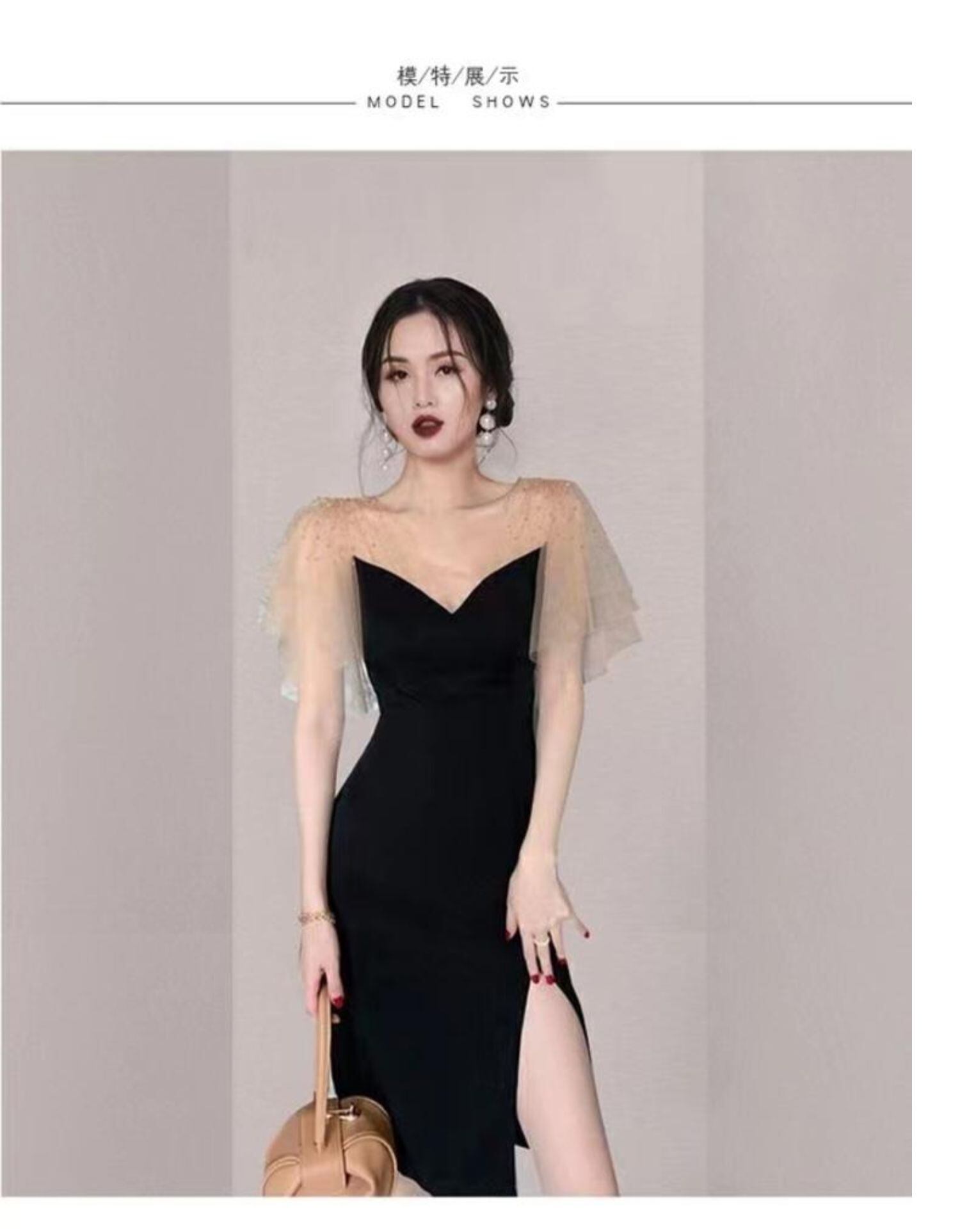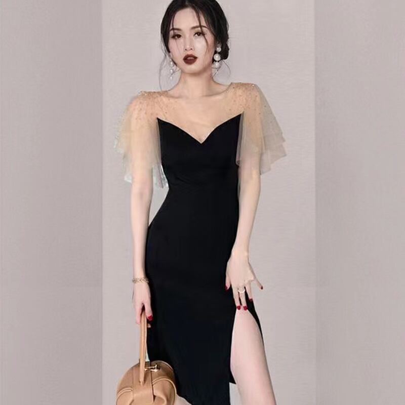 フランスのレトロなヘップバーンスタイルのリトルブラックドレス気質フェミニンなセクシーなライト成熟したスタイルスリムバッグヒップスプリットドレス夏 サマー 夏物 yingd17908805380
