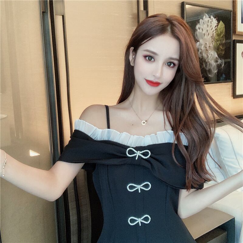 夏のフランスのレトロなヘップバーンスタイルの小さな黒いドレス気質の女神ファンセクシーなワンショルダードレス女性の腰は細かった ブラック サマー 夏物 yingd11483433404