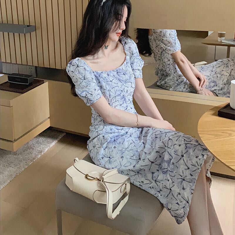 フランスのレトロなティーブレイクドレスレディースサマードレス2021新しいコールドスタイルのハイエンドセンススクエアネックパフスリーブフローラルドレス 夏物 花柄 スクウェア yingd19442831552