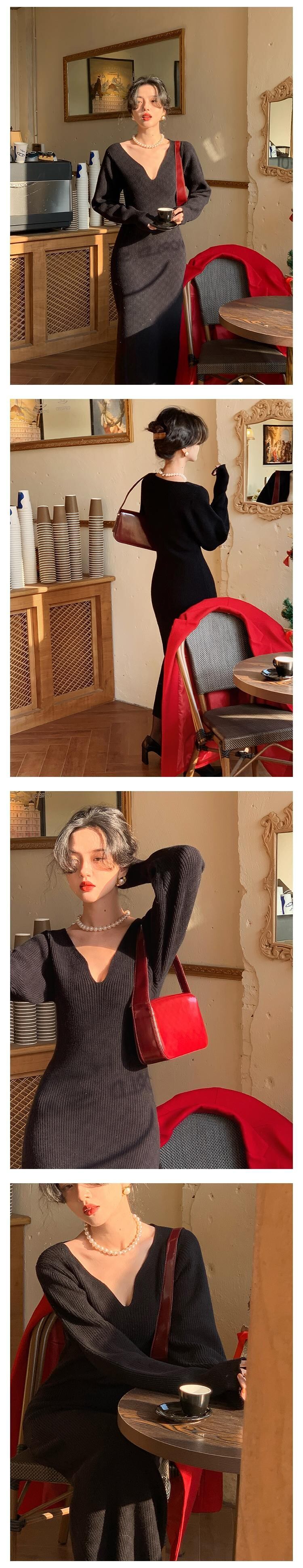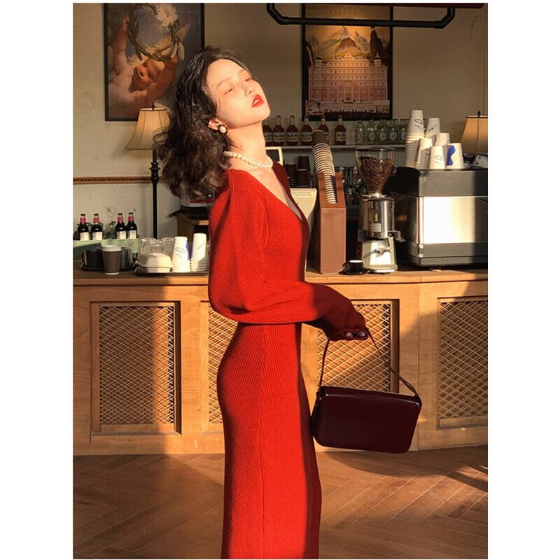 内側にコートが入ったニットワンピース、秋冬の女性ウエストは細くてセクシーなVネックロングオーバーザニーセータースカート オータム 秋物 ウィンター 冬物 yingd81161144709