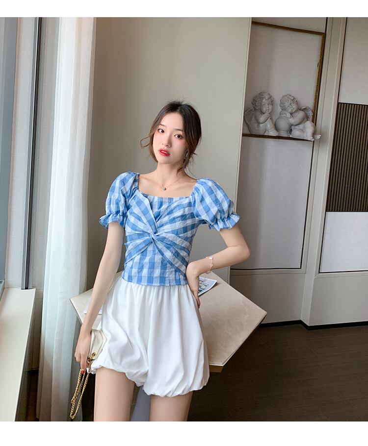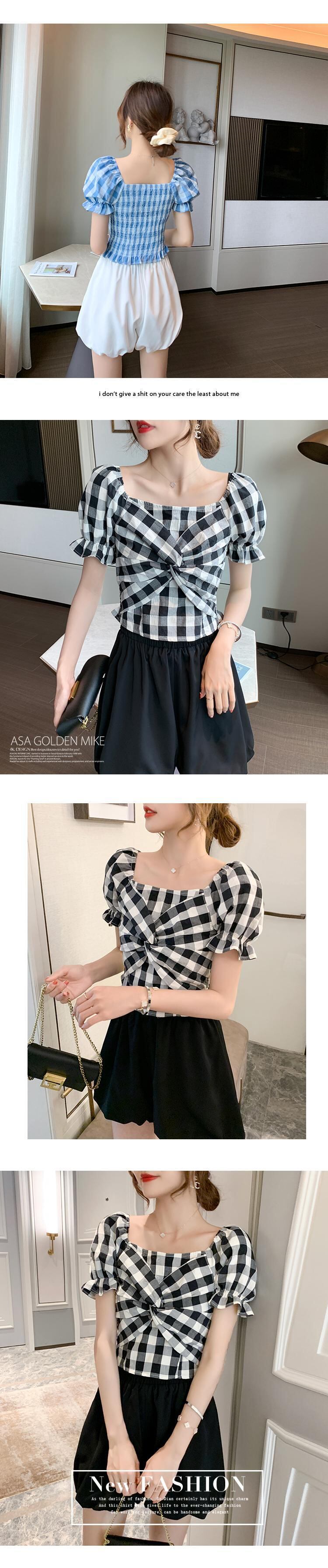 チェック柄シャツレディース2020夏新デザインセンスニッチレトロスクエアカラーパフスリーブトップレディースエインスタイルスモールシャツ サマー 夏物 スクウェア yingd43431695511
