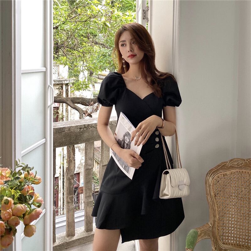 フランスのニッチなレトロなスクエアカラーのパフスリーブウエストウエストは薄い気質の女神ファンドレス女性のヘップバーンスタイルのリトルブラックドレスでした スクウェア yingd59865846569
