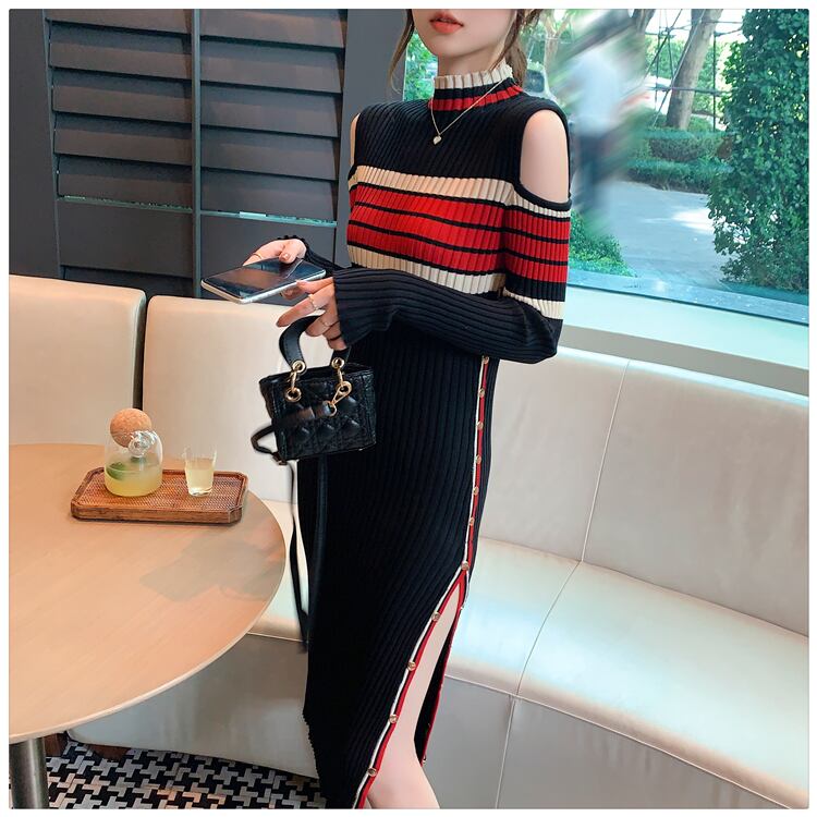 セクシーなストラップレスデザインセンスブレストスリットロングスカートスリムスリミング気質ストライプニットワンピースレディース初秋のワンピース オータム 秋物 yingd12003851195