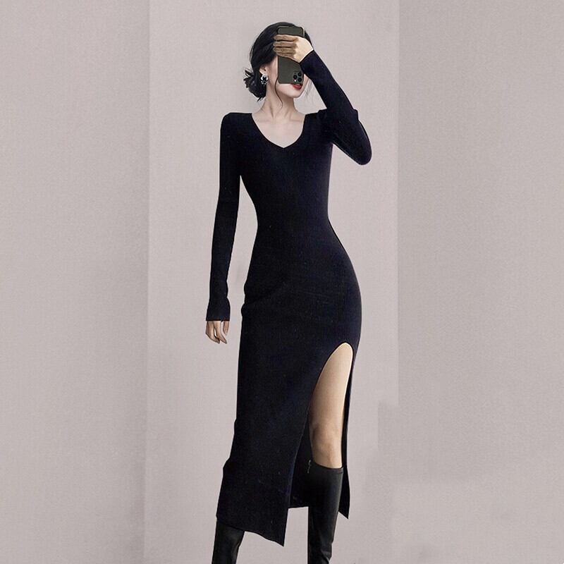 フランスのレトロな長い膝上セータードレススリムスリミングセクシーなスプリットヒップニットドレス女性の秋と冬 ロング オータム 秋物 ウィンター 冬物 yingd77513824202