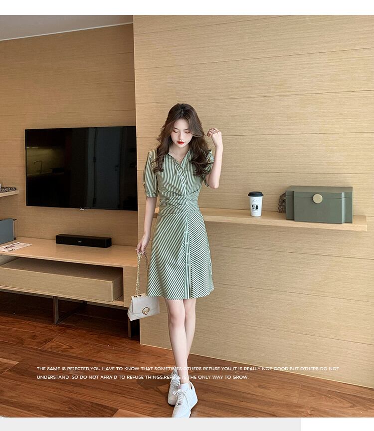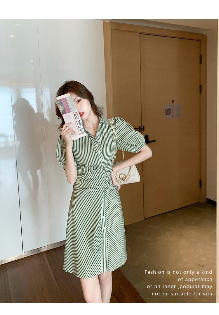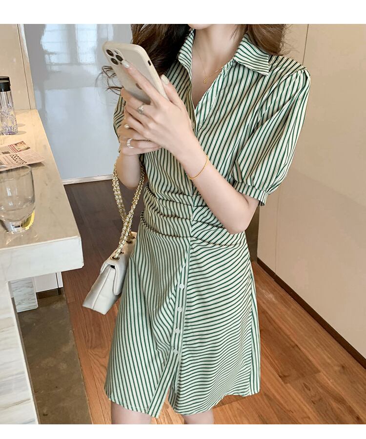 フランスのレトロシックなデザインのスカートのウエストは薄い不規則な折り目ストライプのシャツドレス女性の夏でした サマー 夏物 yingd80580890215