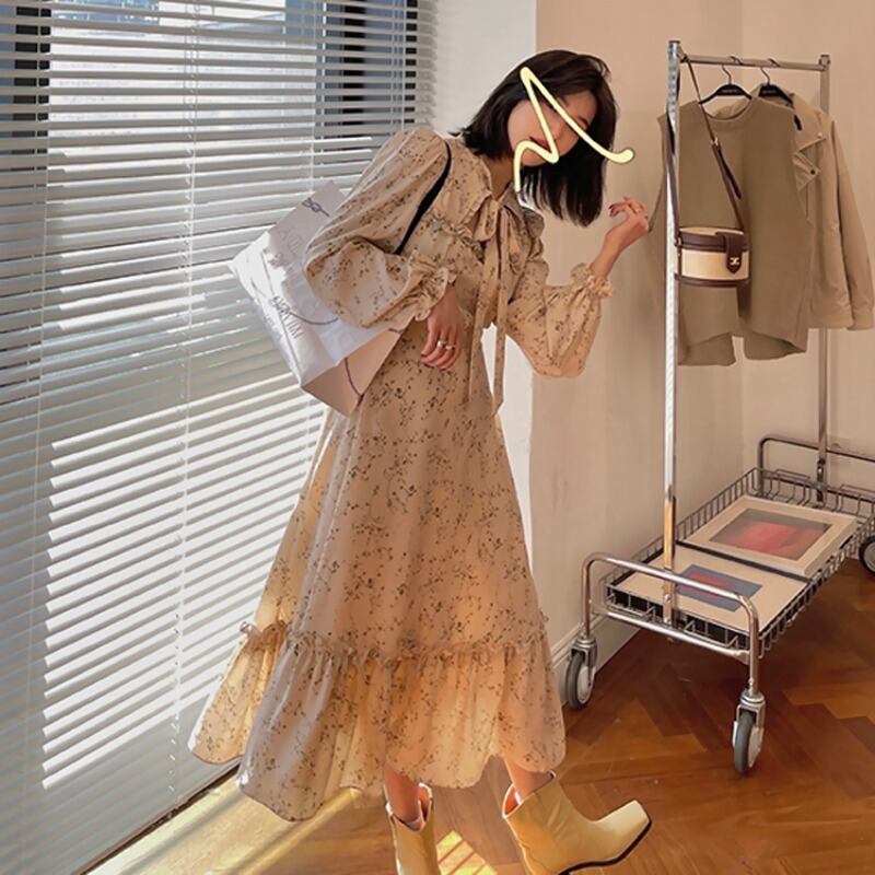 2021年春の新しい女性のフランスのレトロなデザインセンスニッチハイエンド長袖花柄ドレス女性の春と秋 ロング スプリング 春物 オータム 秋物 yingd53506657636