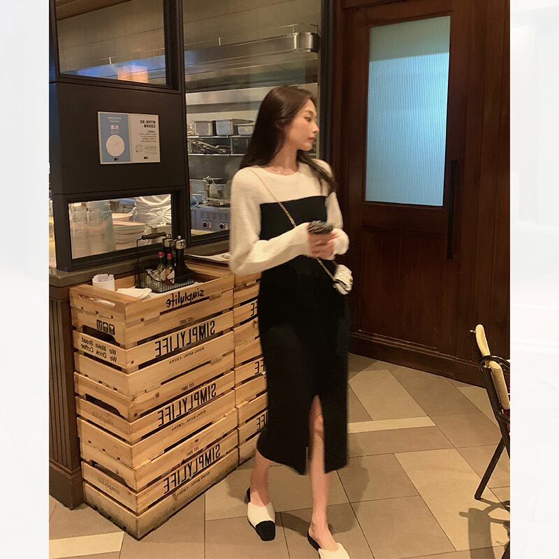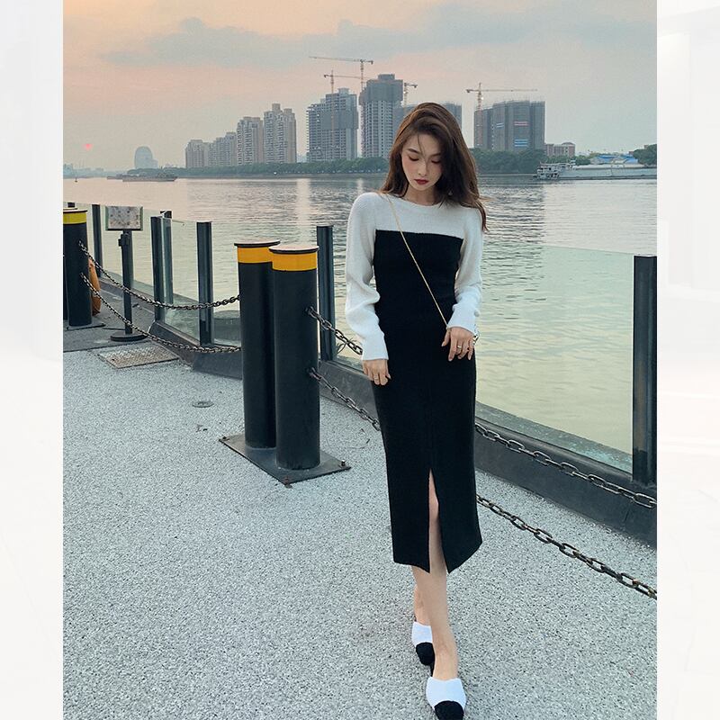フランスの優しい風純粋な欲望ロングバージョン膝上セータードレス気質の女神ファンスプリットステッチニットドレス秋と冬 オータム 秋物 ウィンター 冬物 ピュア yingd11583282431