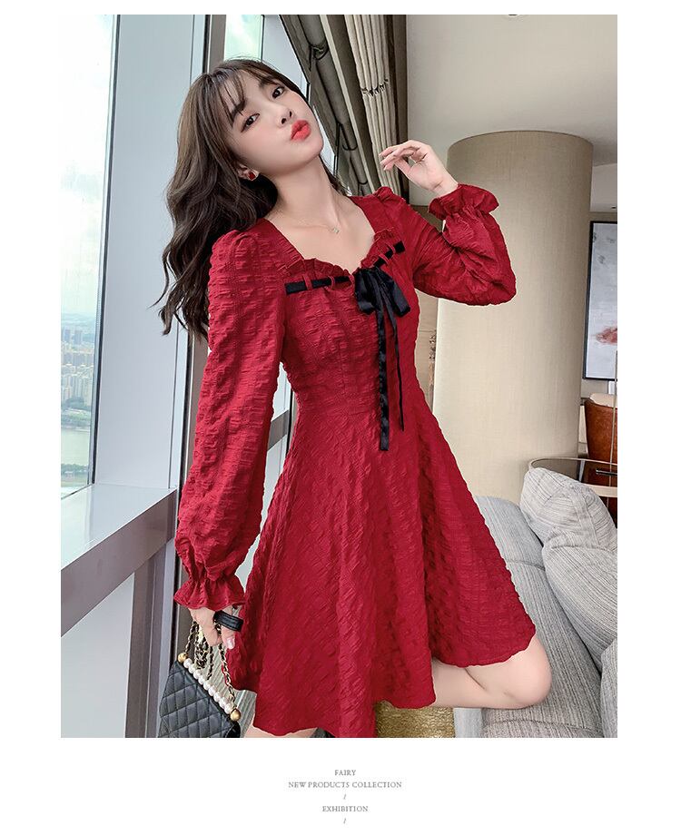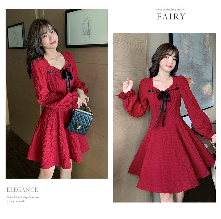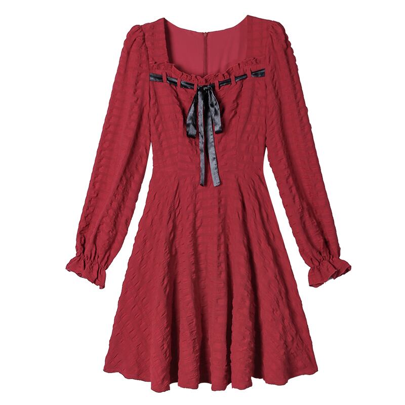 フランスのレトロなニッチPlatycodongrandiflorumスカートのウエストは薄くて気質、四角い襟、注意深い航空機、長袖、赤いドレス、女性の秋のドレス ロング レッド オータム 秋物 スクウェア yingd72654040747