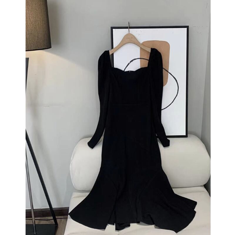 フランスのレトロなヘップバーンスタイルのリトルブラックドレスのウエストは細く、気質のスクエアネックパフスリーブセクシーなスプリットフィッシュテールドレス スクウェア yingd9470764142