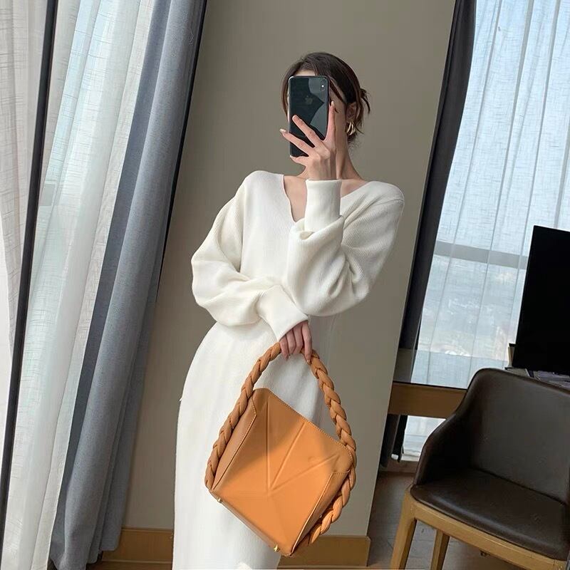 冬のロングオーバーザニーセータードレススリムスリミングフレンチ優しい風Vネックホワイトニットワンピース女性 ウィンター 冬物 yingd10352631046